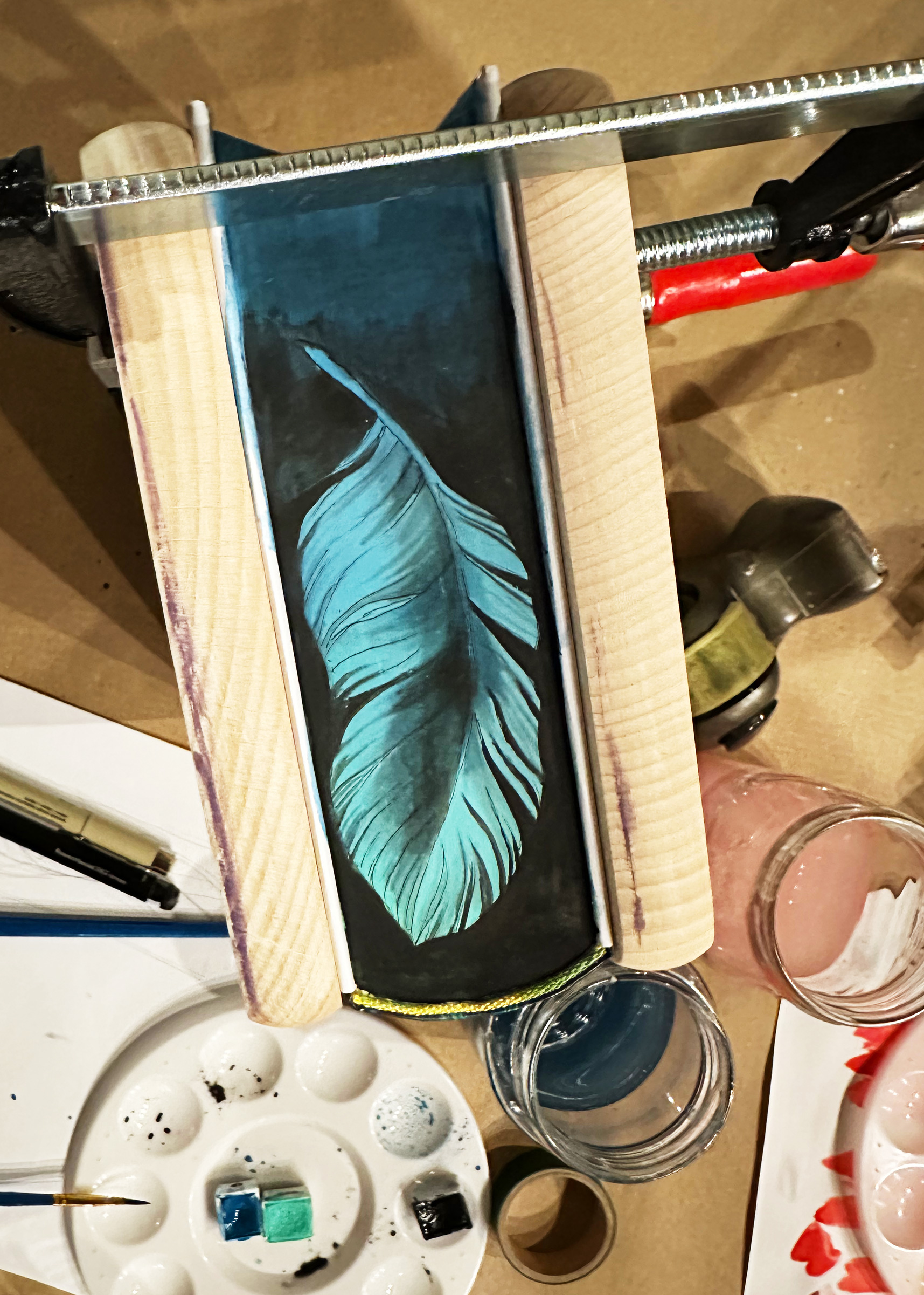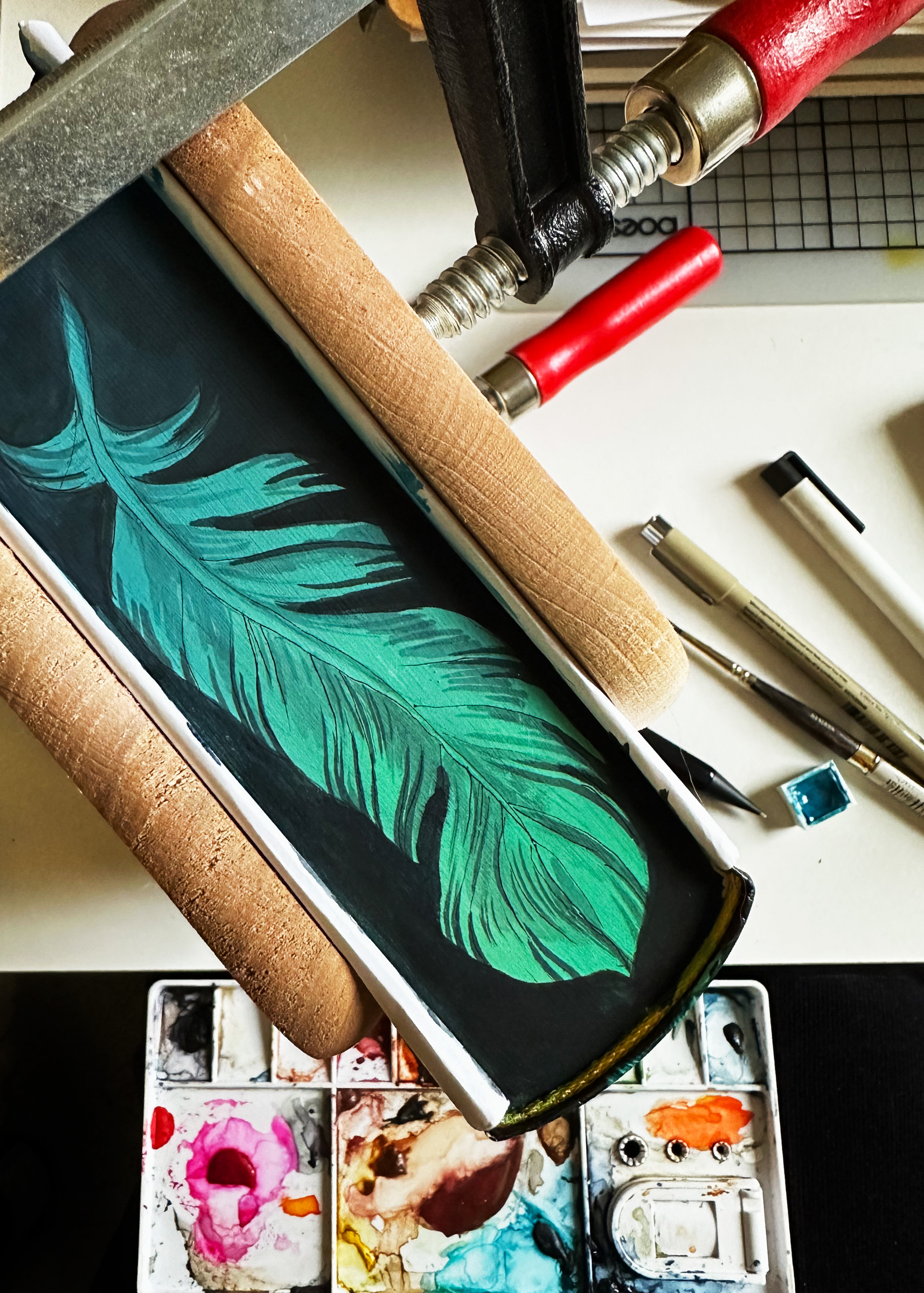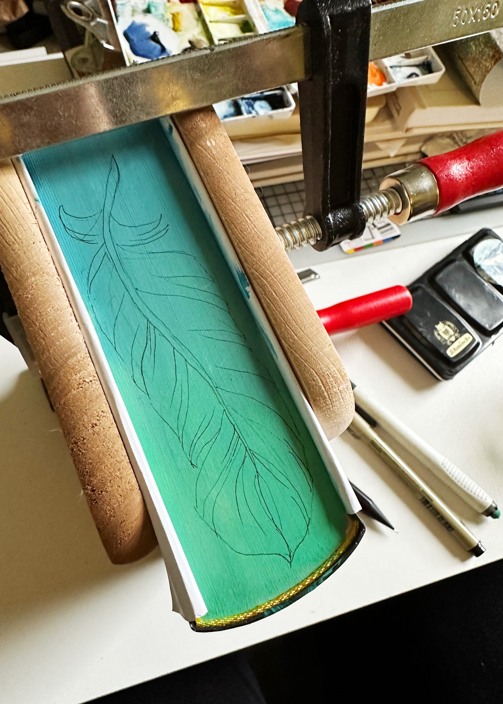 Dann habe ich begonnen den türkisen Bereich um die Feder mit schwarzer Farbe zu übermalen. Ein “negative Painting“, wenn man es technisch beschreiben will. Vom Buchrücken aus zum Vorderschnitt hin mit immer weniger Pigmenten (DAS bedarf noch Übung, damit das wirklich so wird wie ich es mir vorstelle…), damit auch dies einen Verlauf ergibt.