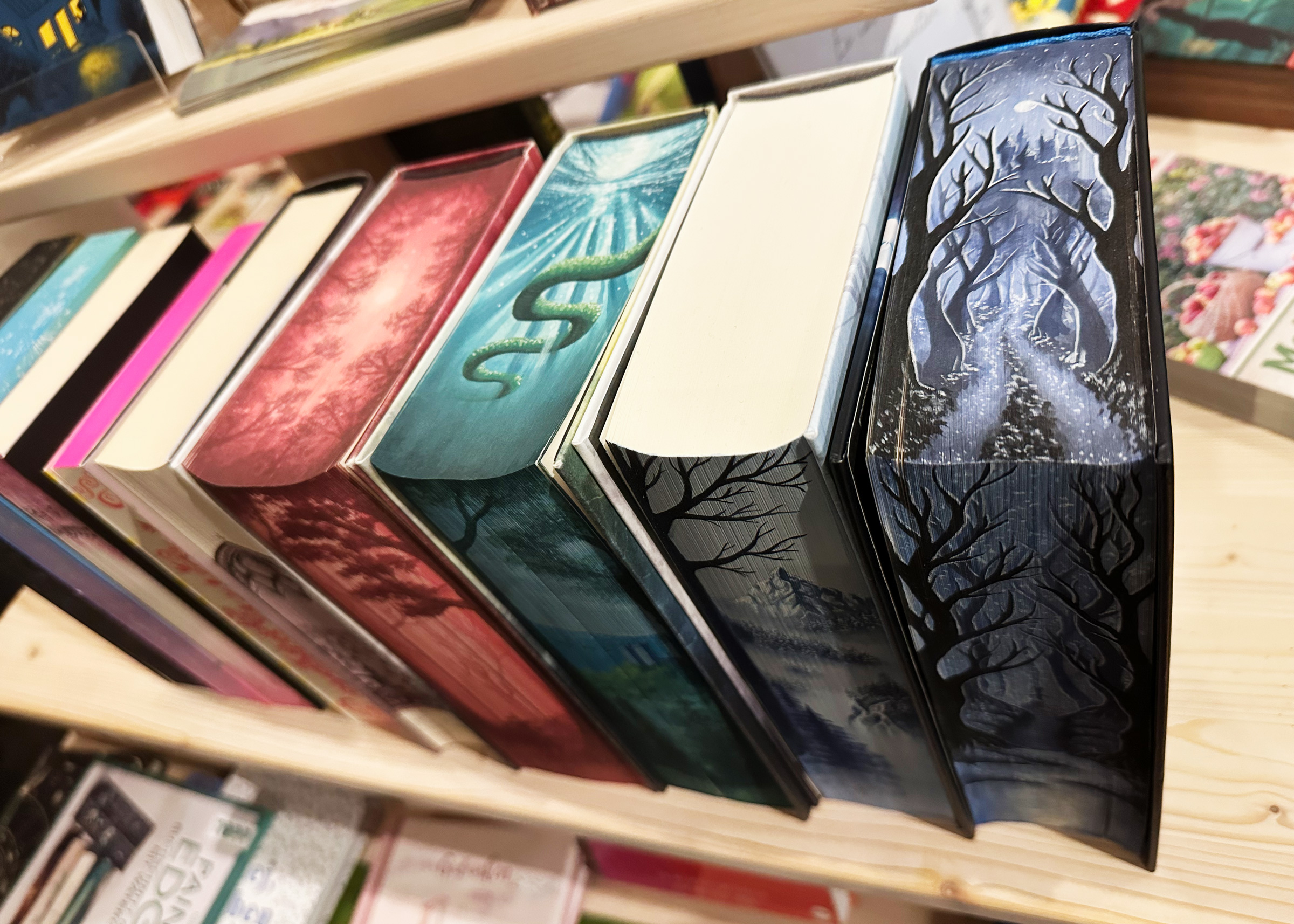Gerade die Bücher der Genre Young Adult und New Adult übertreffen sich an bedruckten Buchkanten – egal ob Soft- oder Hardcover. Neben den anderen Veredelungsmöglichkeiten, die die Verlage dafür hervorholen von Relieflacken, Soft Feel-Kaschierungen, Gold-, Silber und anderen Effekt-Folierungen… quasi „der letzte Schrei“.