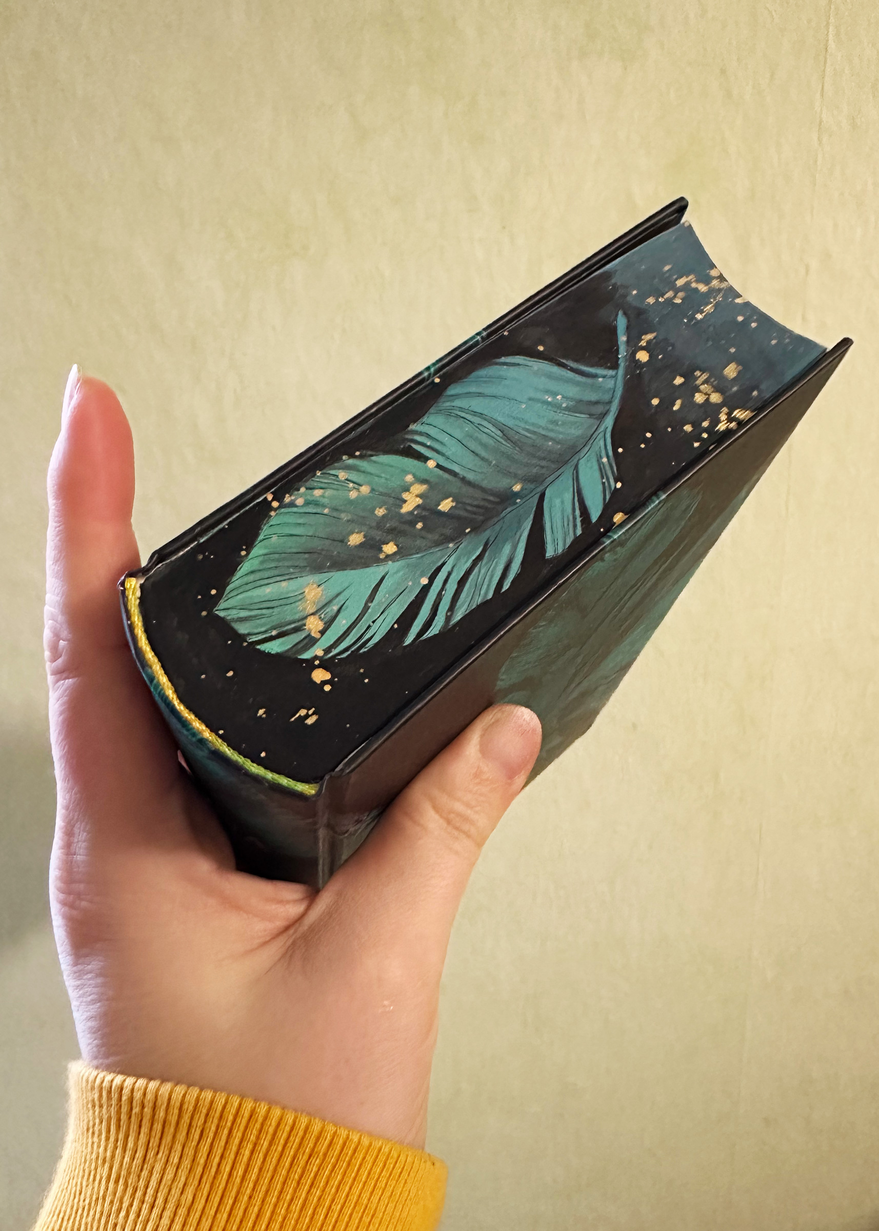 Am Tag danach habe ich zuhause noch auf die Unterseite, den Unter- oder Fußschnitt, eine weitere Feder analog zu der oben gemalt und über alle drei Seiten Sprenkel verteilt. Nun ist das Buch, zu dessen Inhalt ich gar nichts sagen kann, ein Unikat, ein kleines Kunstwerk. Ob ich es nun endlich auch lesen werde?