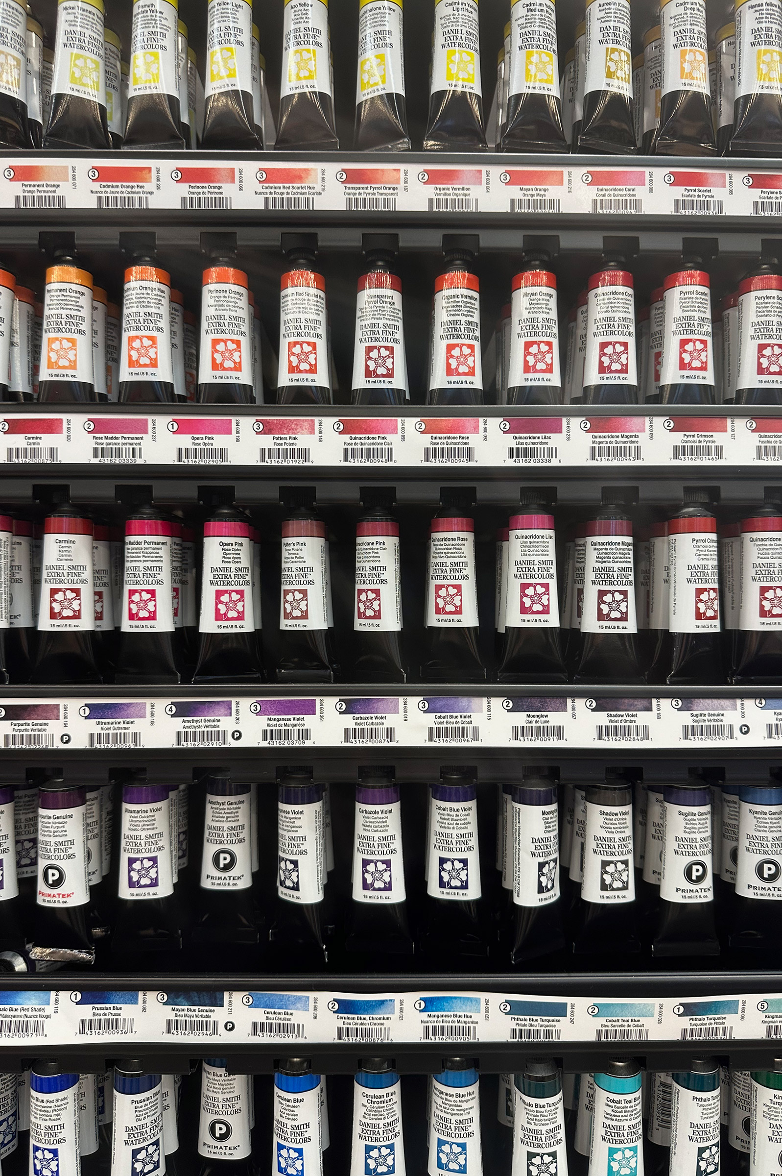 Abgerundet wird das Regal am Kopfende mit Gouache und anderen Sets in ansprechend gestalteten Verpackungen.
