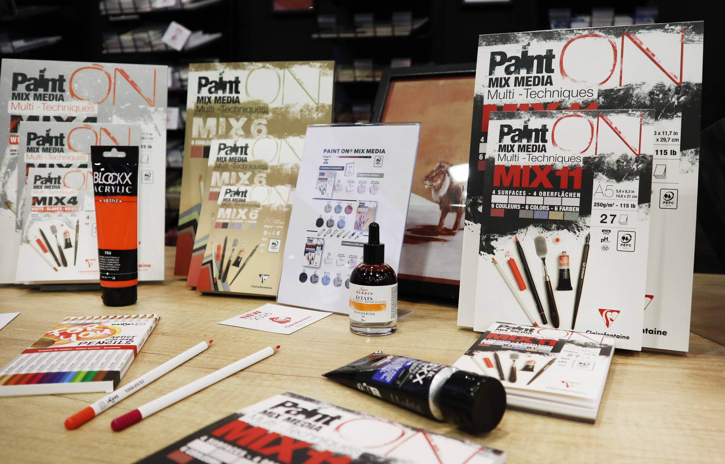 Der große Messestand der Clairefontaine-Rhodia Gruppe ist wie ein kleines Dorf inmitten der Messe. Durch verschiedene Tore tritt man hinein und findet alles von Künstlerbedarf, über Material für Hobby und Einsteiger, Basteln und DIY, bis hin zu Schreibwaren, Papeterie, Geschenkpapieren und Accessoires. Eine immense Fülle an neuen Produkten, die kaum zu überschauen ist.