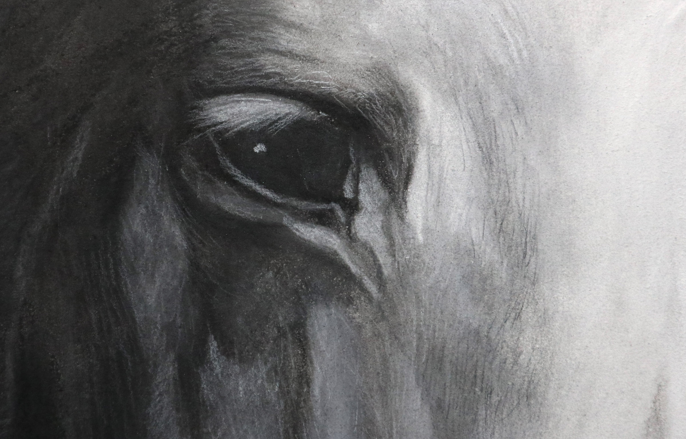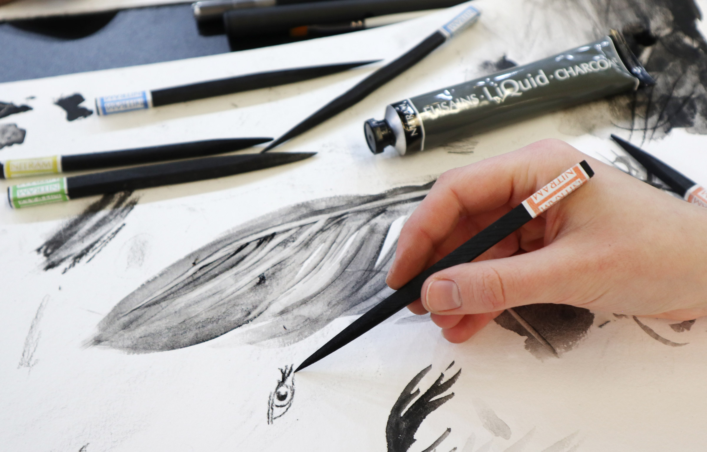 Letztes Jahr sah man hier einen Oktopus, dieses Jahr einen Schimmel im Galopp auf etwa 1,8 mal 4,5 Meter von der Künstlerin Zuzanna Salamon. Der Firmenchef berichtete mir über die Produkte von der flüssigen Kohle, der neuen Aquarell Kohle mit Namen „Nitram Fusain Aquarelle“, mit der das Pferd im Galopp entstanden ist, und den Kohle-Sticks in verschiedenen Härtegraden. Die Künstlerin erklärte mir wie sie an dem großen Gemälde aus Kohle gearbeitet hat. Spannendes Thema, auch wenn ich eher bei flüssigem Schwarz zuhause bin.